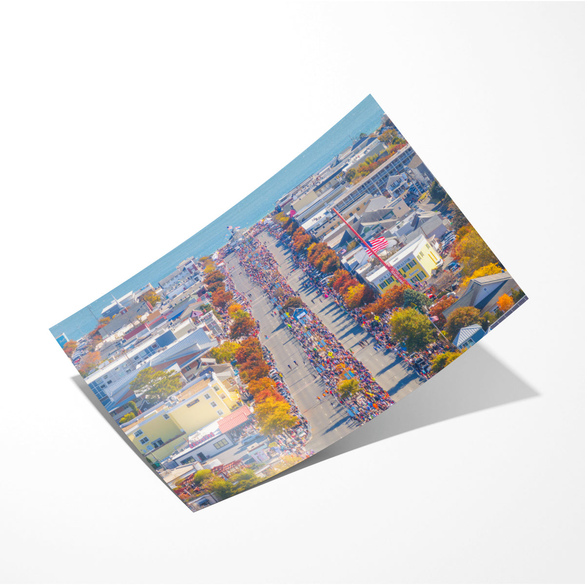 Experience the magic of Delaware’s largest event with “Parade of Magic and Memories,” a breathtaking aerial photograph captured during the 2024 Sea Witch Parade in Rehoboth Beach, Delaware. Taken with a Mavic 3 Pro drone, this centered view of Rehoboth Avenue highlights tens of thousands of spectators lining the streets to celebrate this beloved annual tradition. The scene captures the vibrant energy of the festival, set against a backdrop of autumn hues as the trees lining the avenue glow in shades of red, orange, and yellow.