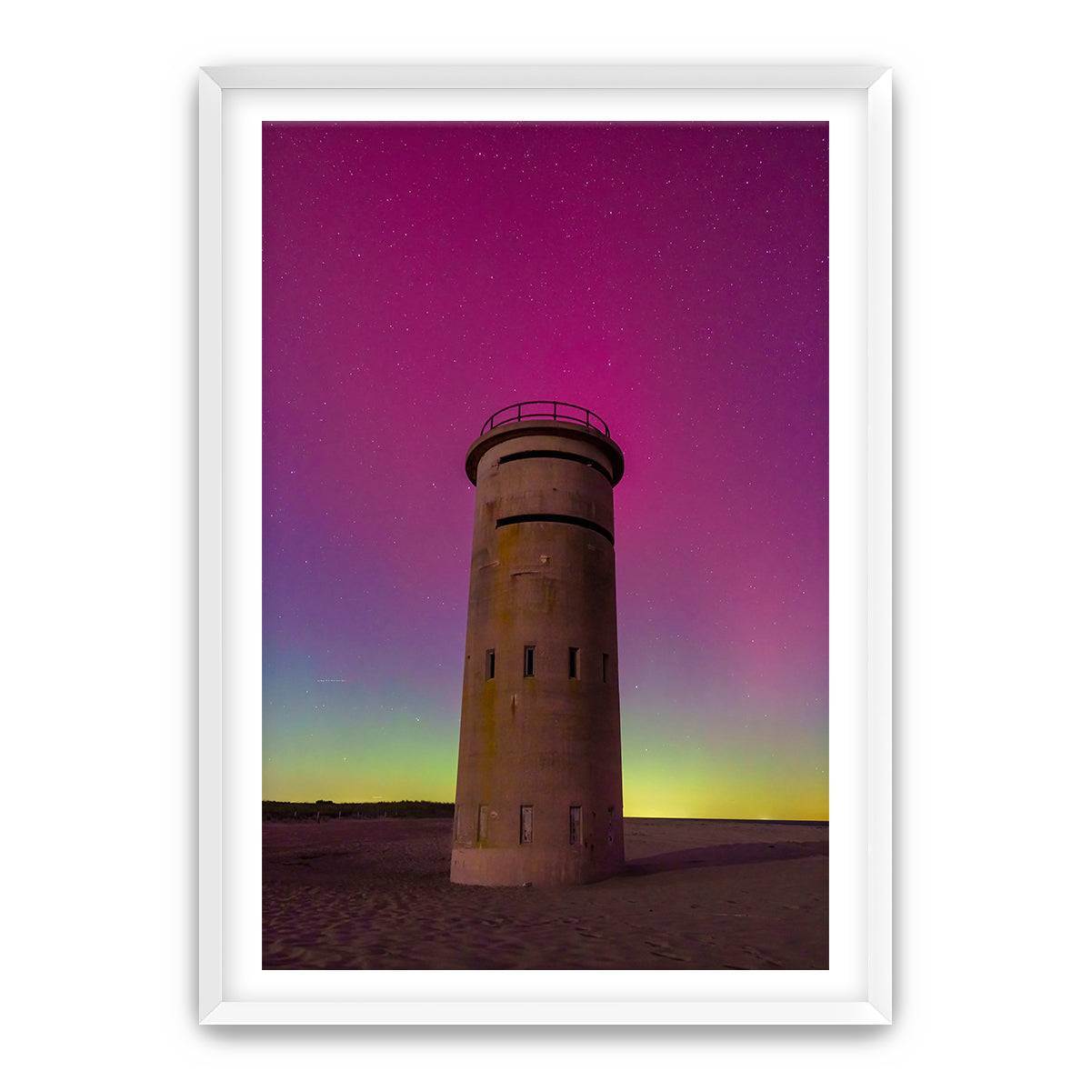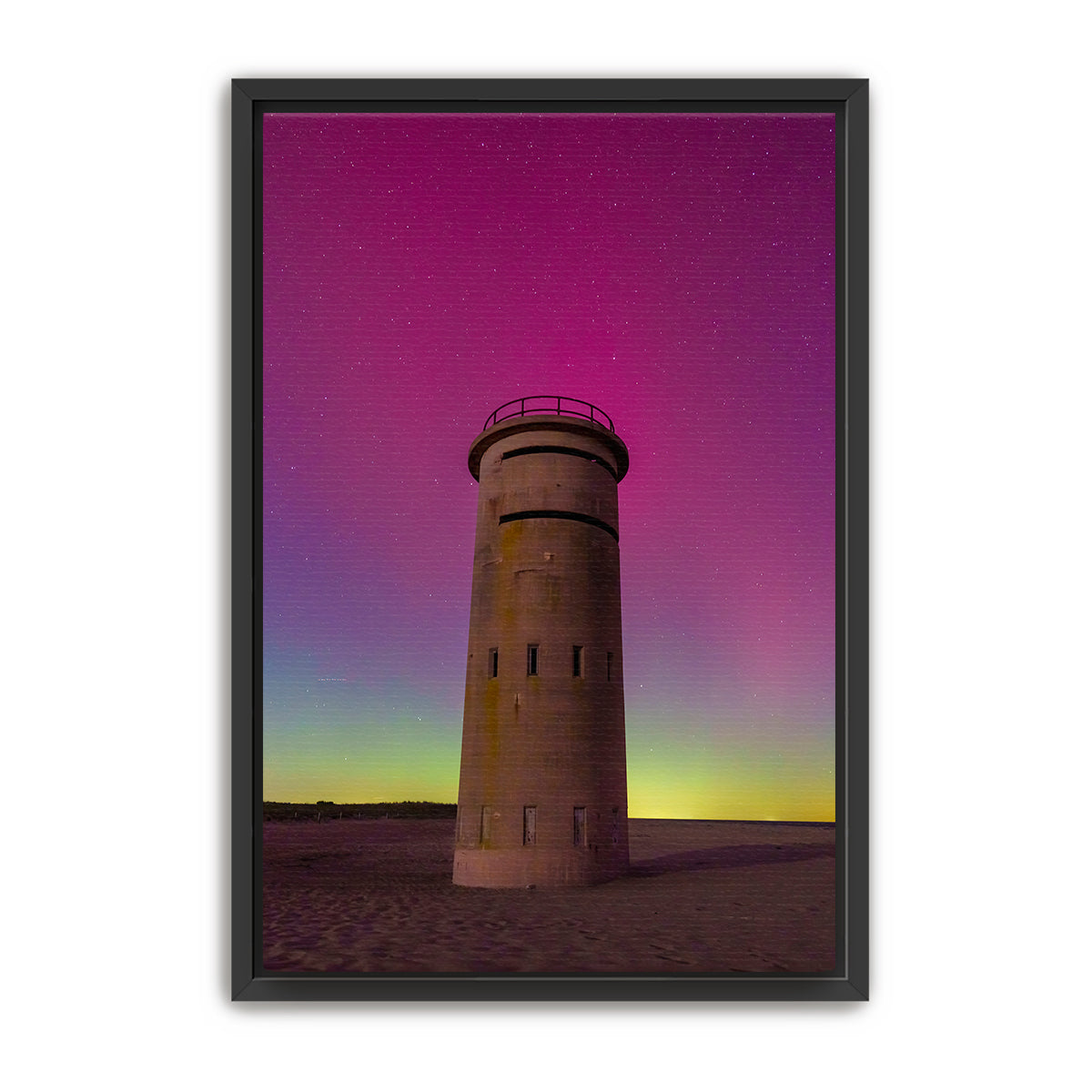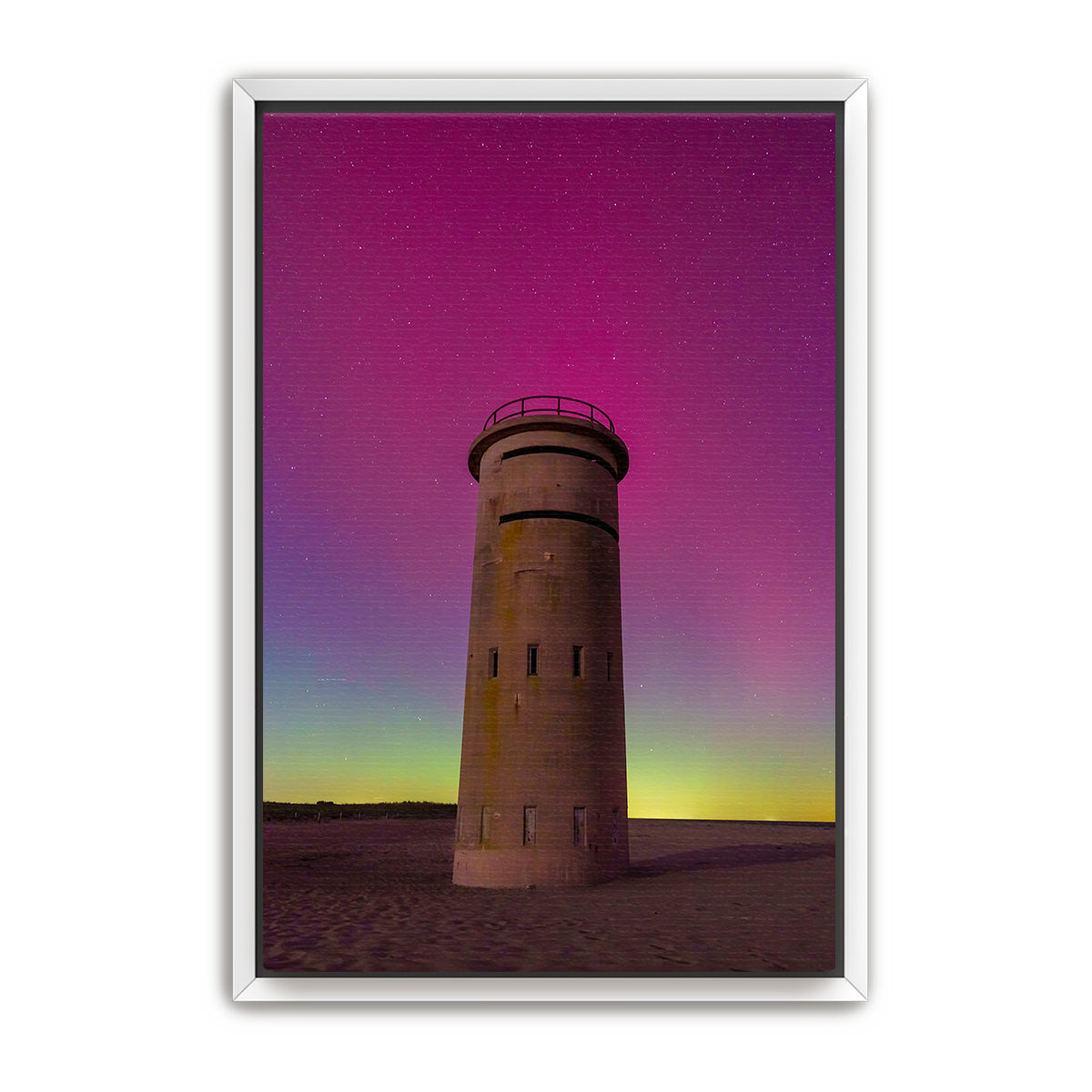 Available as a print, framed print, canvas, or framed canvas, “Standing Tall” highlights the unexpected beauty of the Northern Lights along Delaware’s coastline, a truly memorable moment at this iconic site.