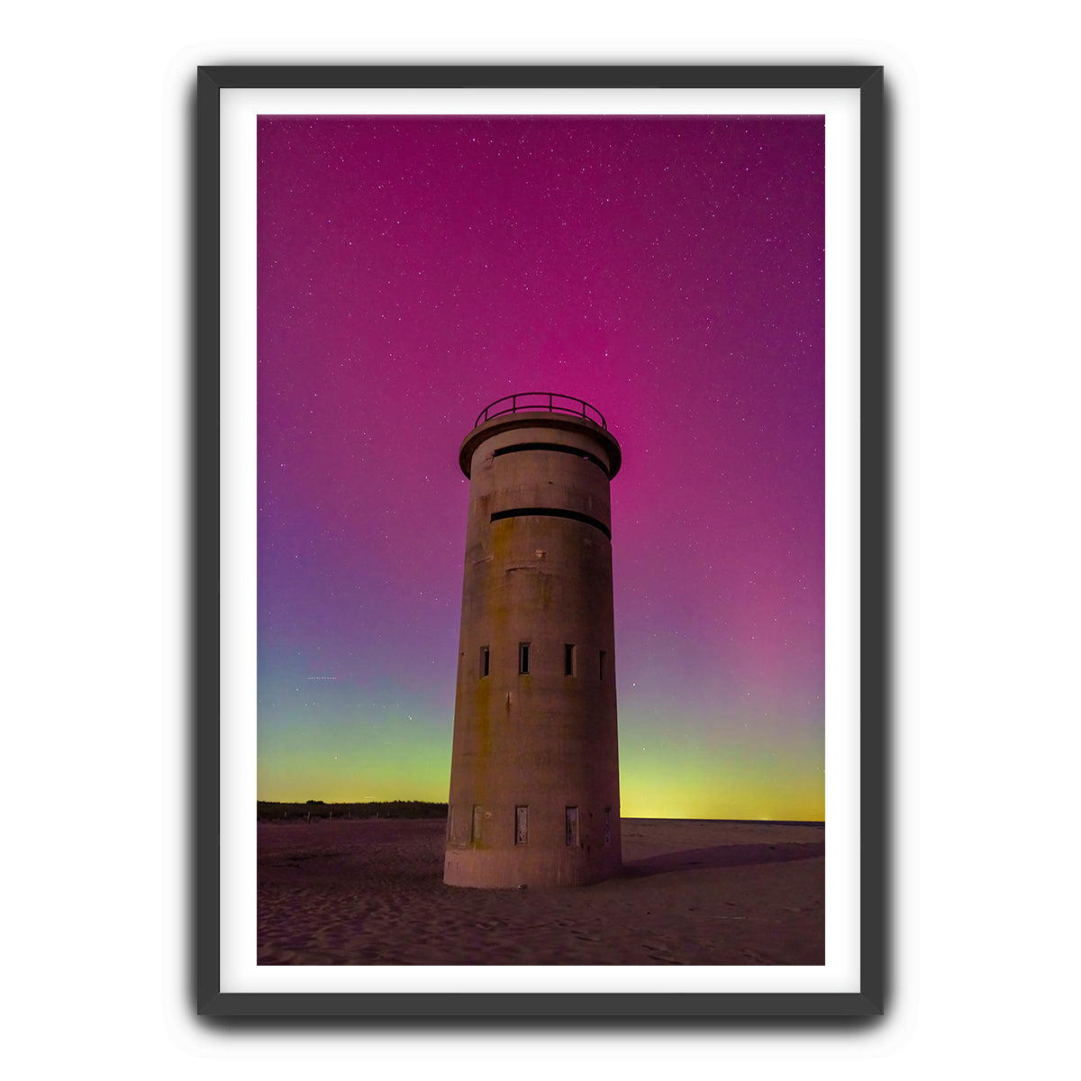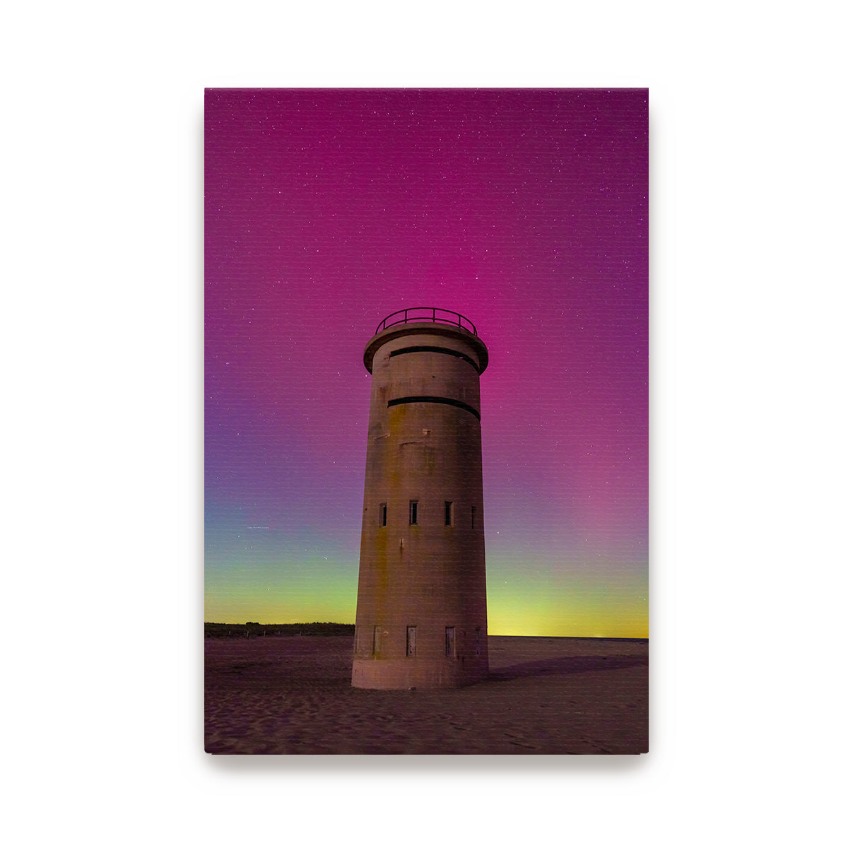 This portrait version captures the awe-inspiring scene of the Northern Lights dancing above Fire Control Tower 5 at Gordon’s Pond State Park. Witnessing the vibrant colors of the aurora borealis from such a familiar location is a rare and magical experience. Having worked at Gordon’s Pond for years, seeing the World War II tower under these conditions was nothing short of extraordinary. The deep reds, greens, and purples in the sky create a sense of wonder and amazement, perfectly complementing the historic structure.