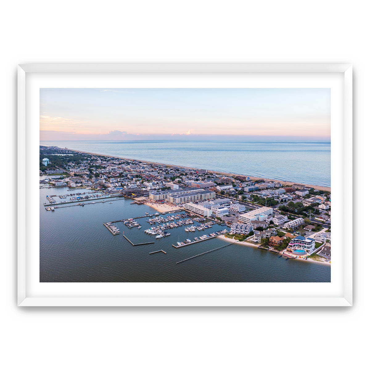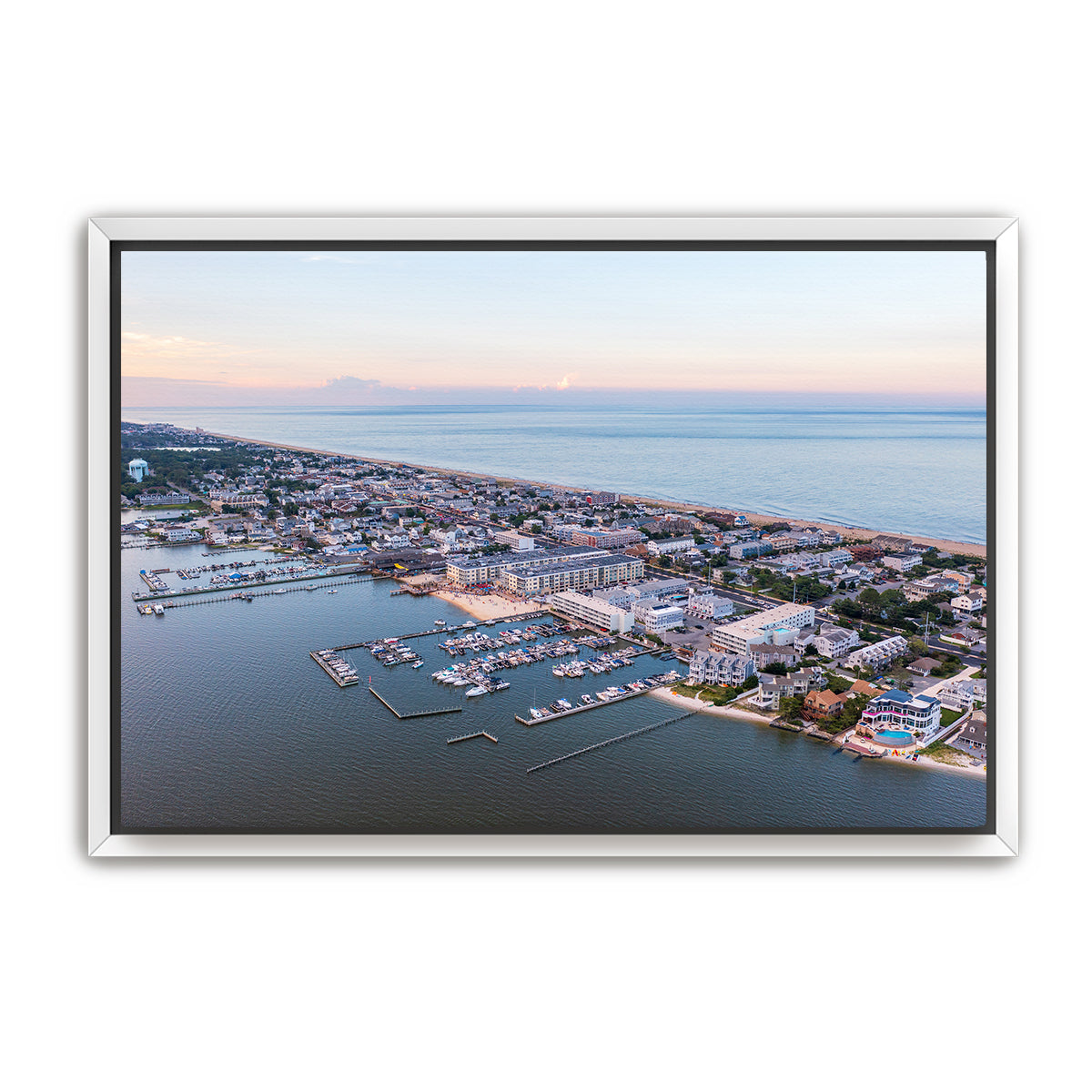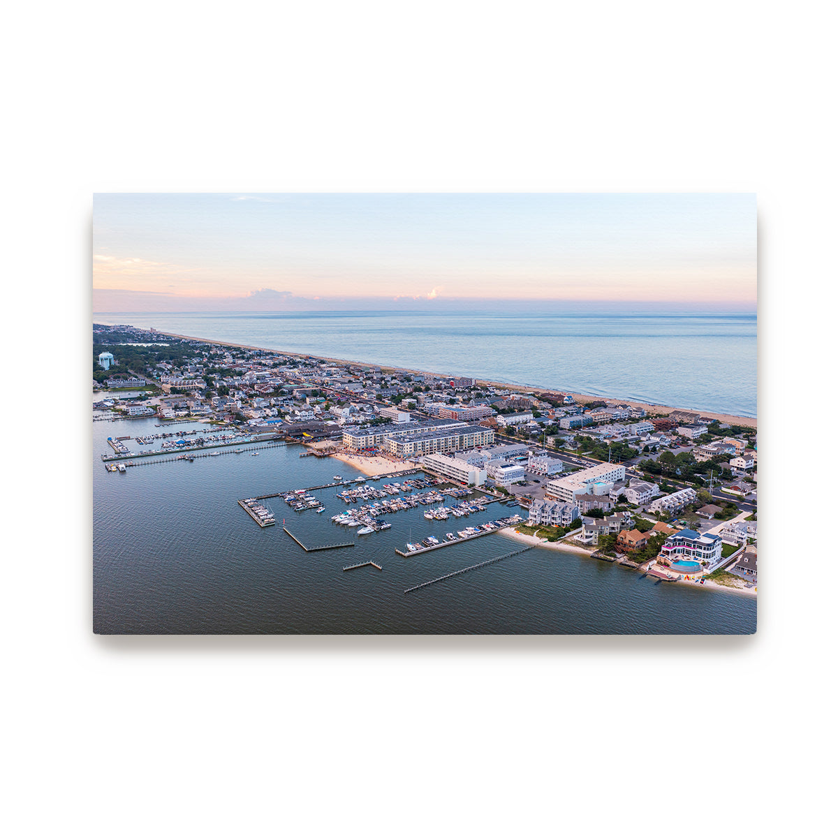 This aerial perspective captures Dewey Beach’s perfect balance of peaceful twilight beauty and lively beach life. The boats are docked in the bay, the streets are quiet for now, but the energy of the night is just beginning to build as the vibrant beach town prepares for another unforgettable evening.