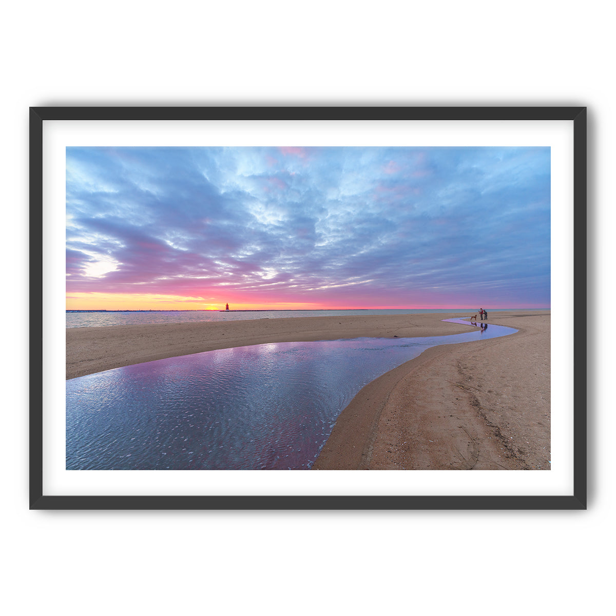 Capture the quiet beauty of an off-season evening at Cape Henlopen State Park in Lewes, Delaware, with “Cape Dog Walk.” This serene photograph features a stunning sunset as a man and woman stroll along the empty beach with their dog, enjoying the solitude of the shore. The vibrant colors of the sky reflect off the tranquil water, creating a peaceful and reflective atmosphere.