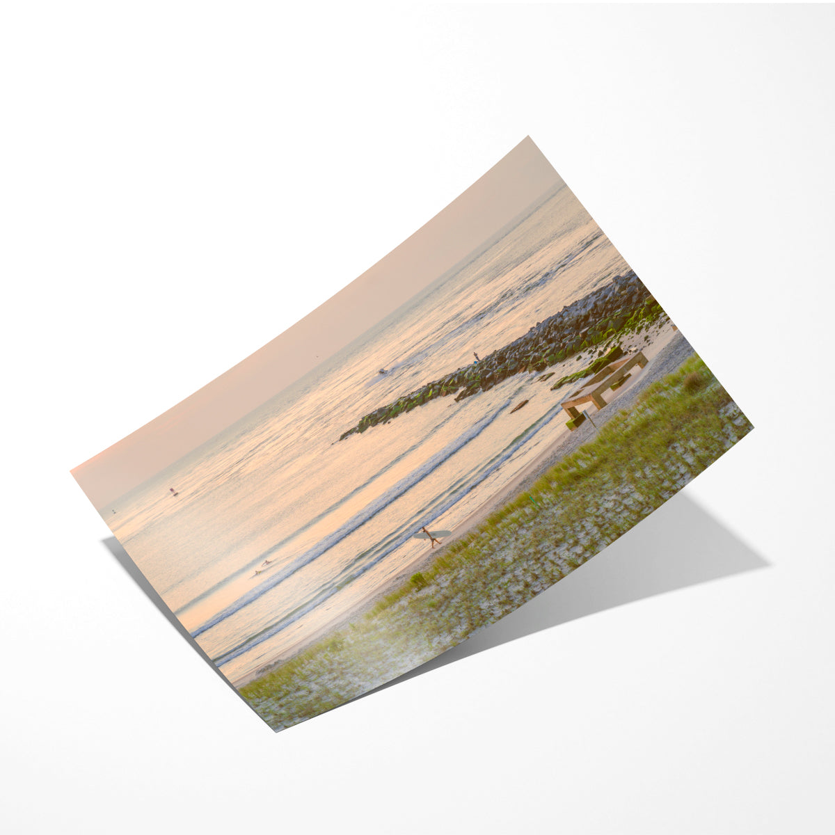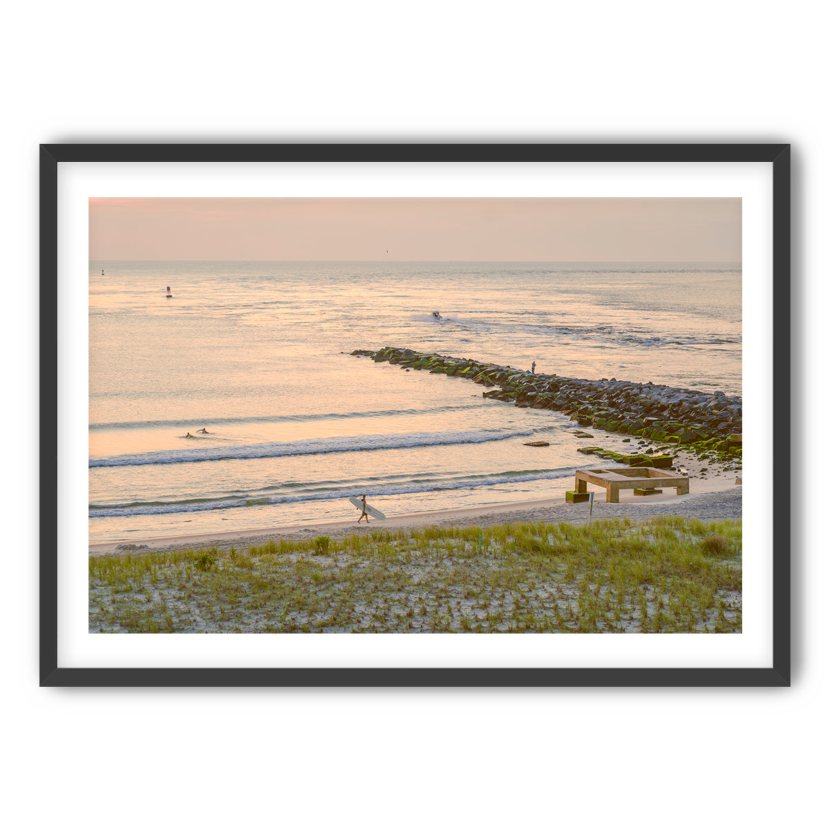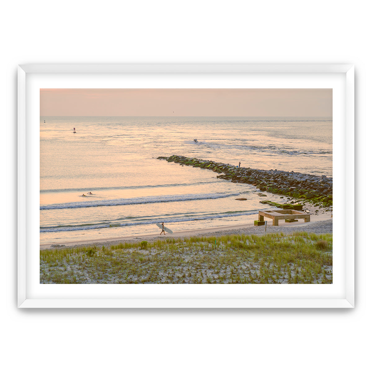 Capture the essence of an early summer morning with “Early Bird,” a peaceful photograph taken at Indian River Inlet in Bethany Beach, Delaware. The image beautifully portrays two surfers paddling out into the calm ocean while another surfer walks back from a refreshing early morning session, all under the soft glow of the sunrise. It’s a perfect representation of a fresh start to the day.