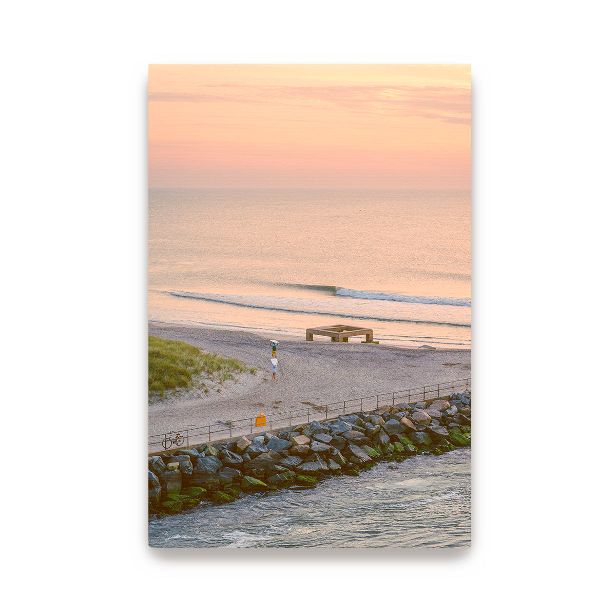 Captured from the top of the Indian River Inlet Bridge, “Sunrise Surf Session” radiates endless summer vibes. The two surfers, with their boards balanced on their heads, make their way towards the calm and inviting ocean, ready to paddle out. The small, clean waves rolling in provide perfect form, creating a sense of peaceful excitement, while the pastel sunrise casts a soft glow over the scene. The calm air and gentle water set the tone for a fun and energizing start to the day, embodying the best of early morning surf culture.