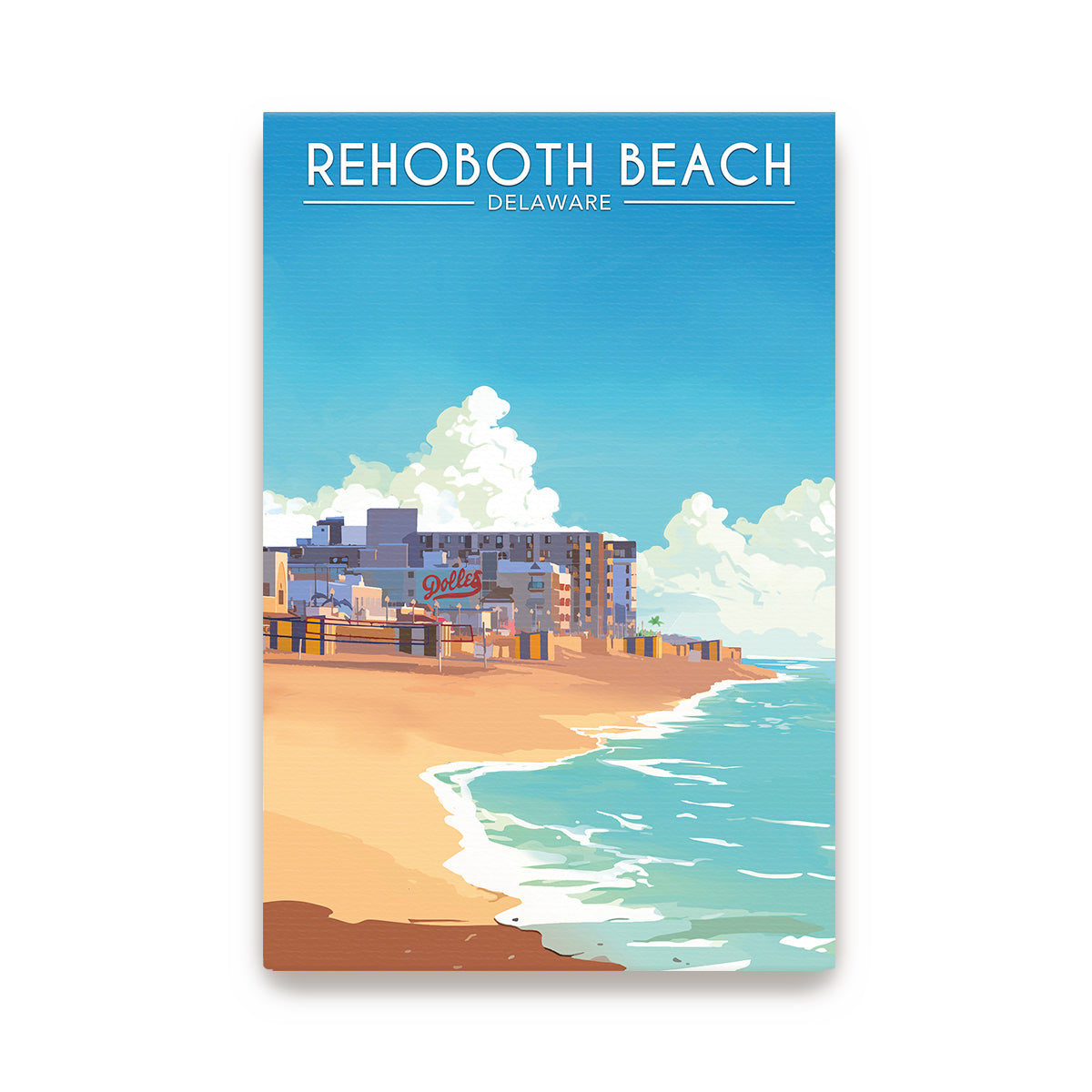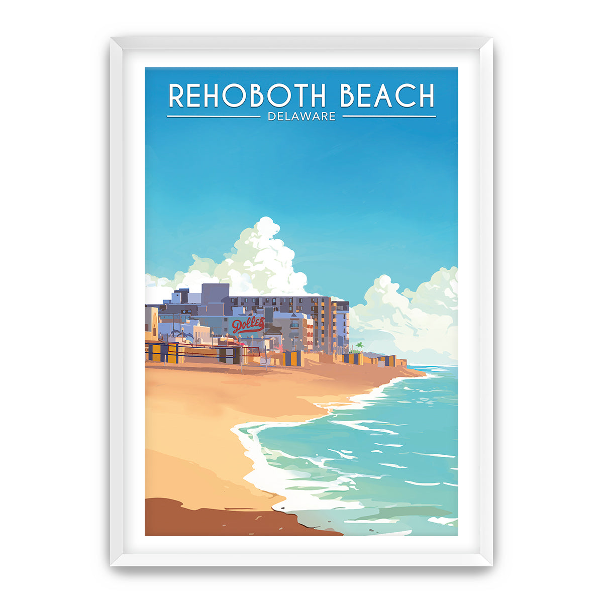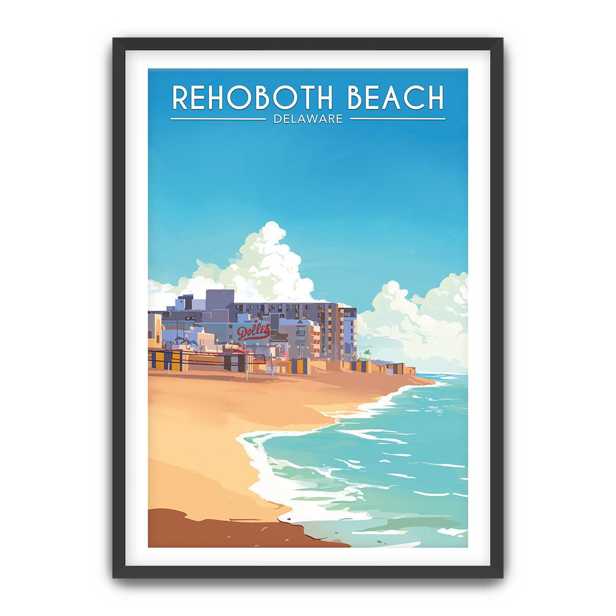 Introducing our iconic Rehoboth Beach travel poster—immerse yourself in cherished memories made at the beach as you gaze upon the renowned Rehoboth Boardwalk from the shoreline, beautifully captured from an original photograph, preserving the essence of Rehoboth Beach, Delaware; this unique poster showcases the famous Dolles sign that is no longer there. Choose from six sizes and relive the magic of your summer vacations by the ocean.