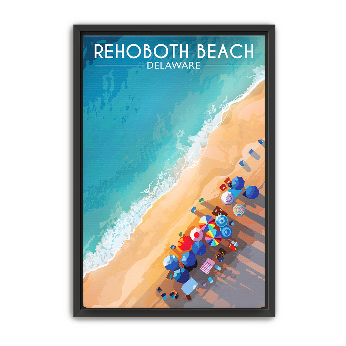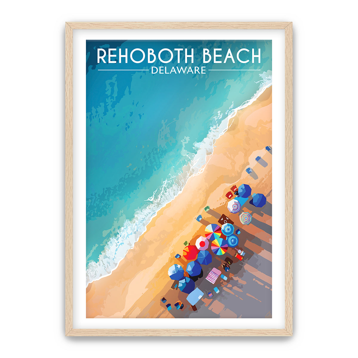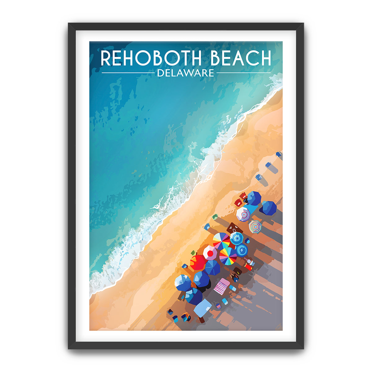 Introducing our captivating Rehoboth Beach travel poster—experience the essence of family time together, the joy of vacation, and the warmth of summer days as you gaze upon this mesmerizing drone shot, capturing crashing waves and colorful beach umbrellas bunched together, all beautifully crafted from an actual photograph that truly embodies the spirit of Rehoboth Beach. Choose from six sizes and bring the magic of this beach destination into your home.