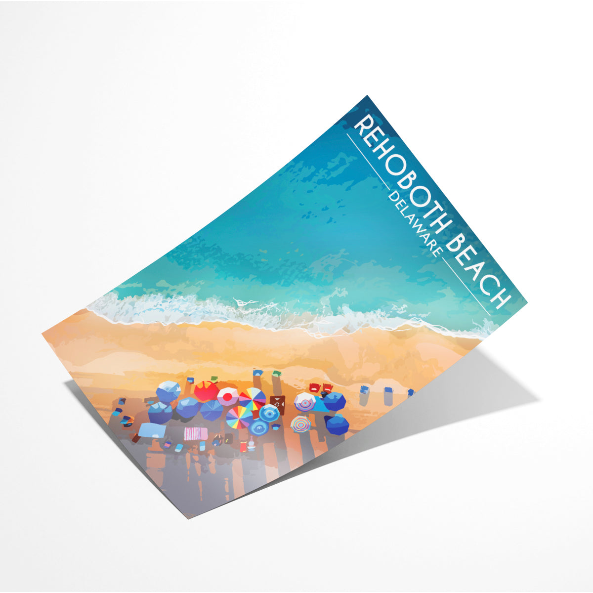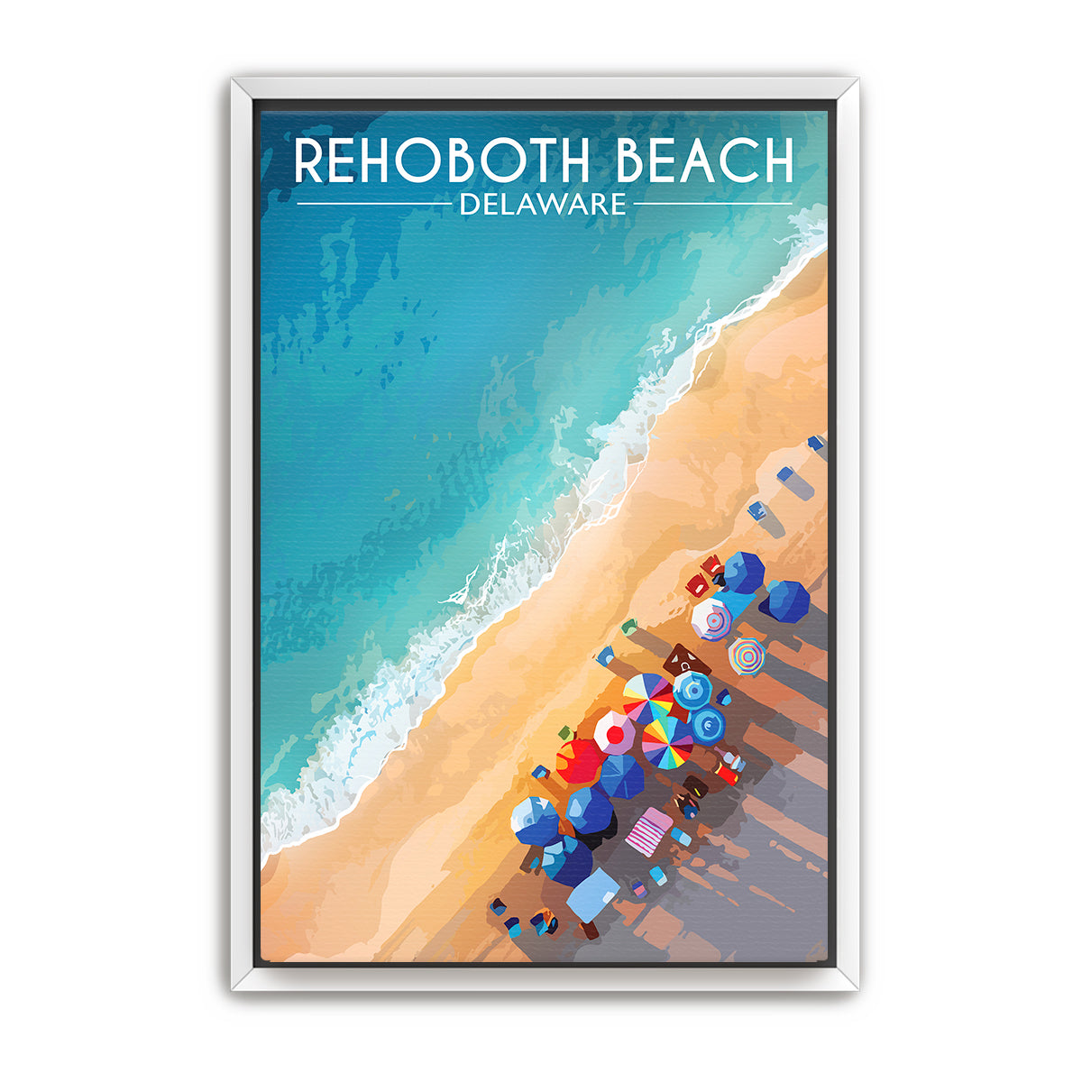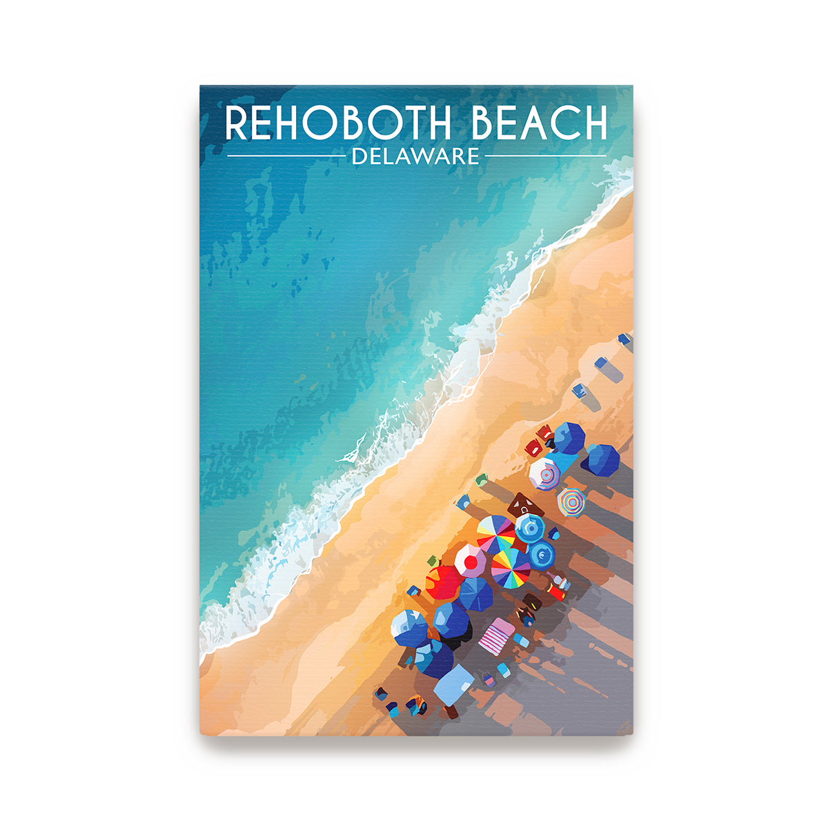 Introducing our captivating Rehoboth Beach travel poster—experience the essence of family time together, the joy of vacation, and the warmth of summer days as you gaze upon this mesmerizing drone shot, capturing crashing waves and colorful beach umbrellas bunched together, all beautifully crafted from an actual photograph that truly embodies the spirit of Rehoboth Beach. Choose from six sizes and bring the magic of this beach destination into your home.