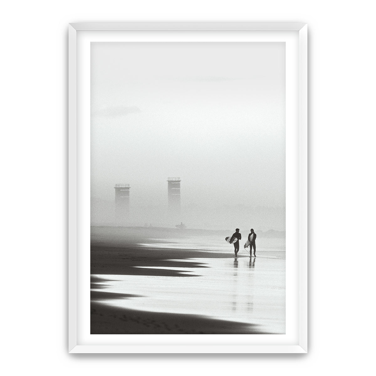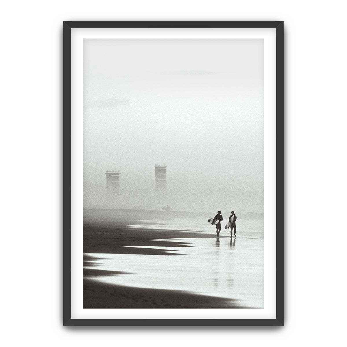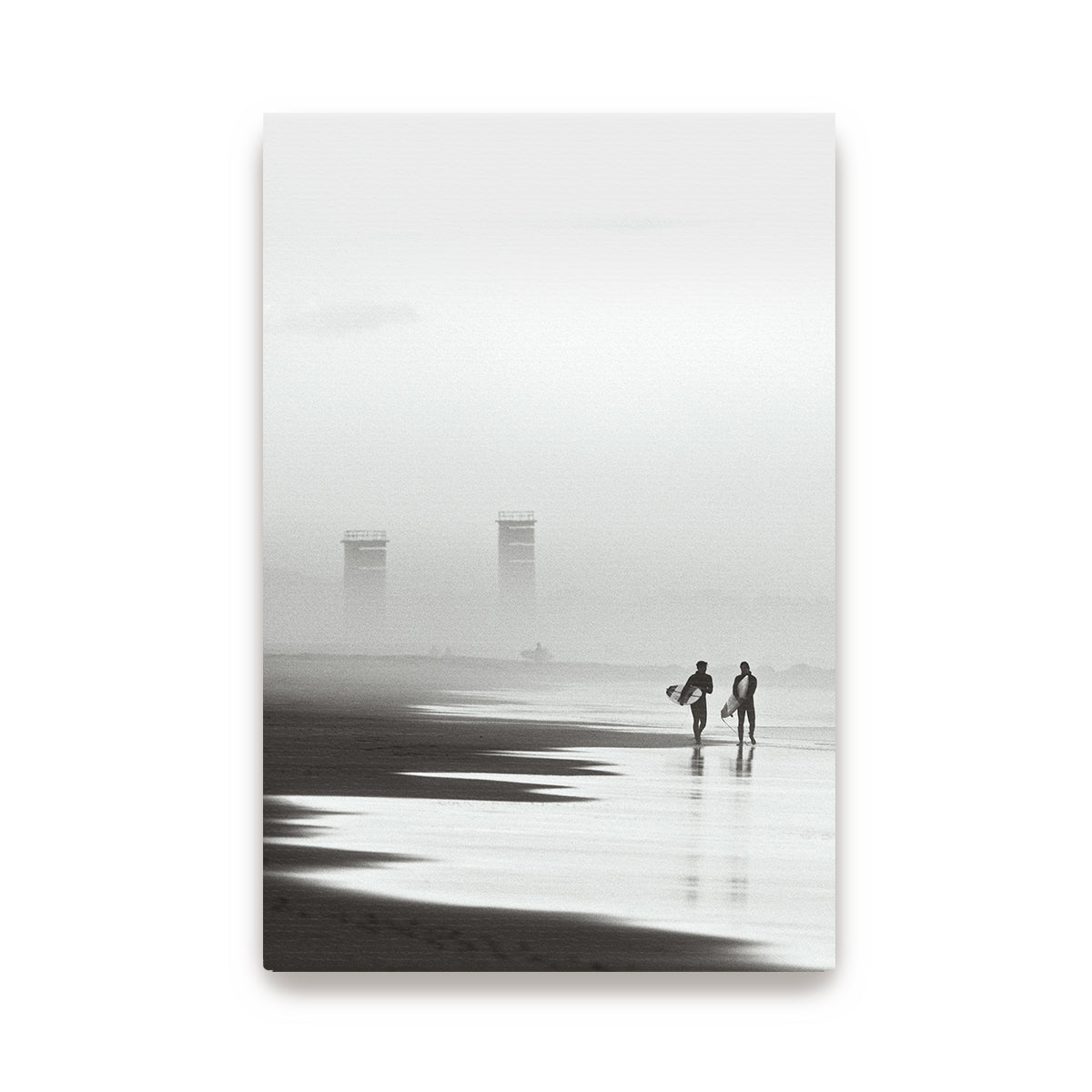 Experience the quiet beauty of resilience and connection with “Twin Towers,” a black-and-white photograph taken during the pandemic at Gordon’s Pond, Delaware. This image features two surfers walking along the shore after a long session, with the iconic World War II watchtowers standing in the misty background. Taken with a telephoto 60mm lens, the scene captures the peaceful solitude of a time when beaches were closed and life felt paused.